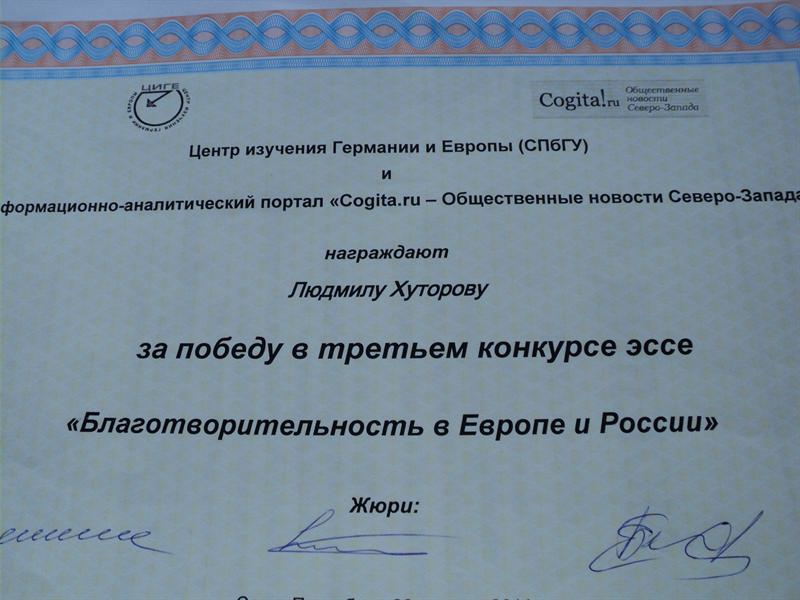 В 2011 г. работа студентов группы ИАР-1-06 Ахметзянова А.А., Ронжиной Ю.Н., Ярошук О.А., выполненная под руководством Хуторовой Л.М. победила в третьем конкурсе эссе «Благотворительность в Европе и России», организованном и проведенном Центром изучения Германии и Европы (СПбГУ) и информационно-аналитическим порталом «Cogita.ru» (Санкт-Петербург).