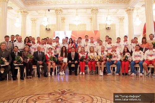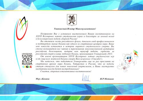 Вчера, 18 июля, в большом зале городской ратуши мэр Казани И.Р. Метшин наградил казанских спортсменов-медалистов Универсиады. Среди 30 казанцев, присутствовавших на церемонии, был и золотой медалист в борьбе на поясах (Корэш) в категории до 90 кг воспитанник спортивного клуба КГЭУ Ильнур Муртазин.