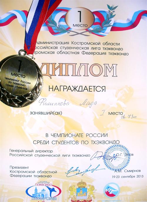С 20 по 23 сентября в г. Косторома проходил Чемпионат Российской студенческой лиги по тхэквондо (ВТФ). В соревнованиях участвовало 188 спортсменов из 84 ВУЗов страны. Среди них и студентка ЦНСПО КГЭУ - Лада Филиппова.