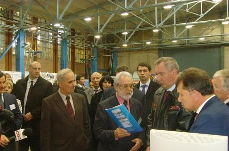 Научный руководитель проекта «Система мониторинга гололеда на ЛЭП» профессор Р.Т. Миннулин рассказывает заместителю председателя правительства РФ Д.О. Рогозину об аппаратуре обнаружения гололеда на проводах линий электропередачи, разработанной в КГЭУ. Дмитрий Олегович с интересом выслушал рассказ профессора Р.Т. Миннулина.