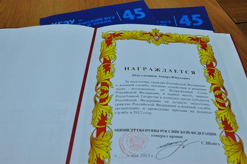25 декабря первый заместитель Премьер-министра РТ Равиль Муратов в торжественной обстановке вручил почётную грамоту, подписанную министром обороны РФ Сергеем Шойгу, ректору Казанского государственного энергетического университета Э.Ю. Абдуллазянову.