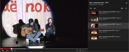 Сейчас в плейлисте "День первокурсника-2014" доступно видео концерта ИЭИТ, а также части концерта ИЭЭ. Оставшееся видео Вы сможете посмотреть в ближайшее время!