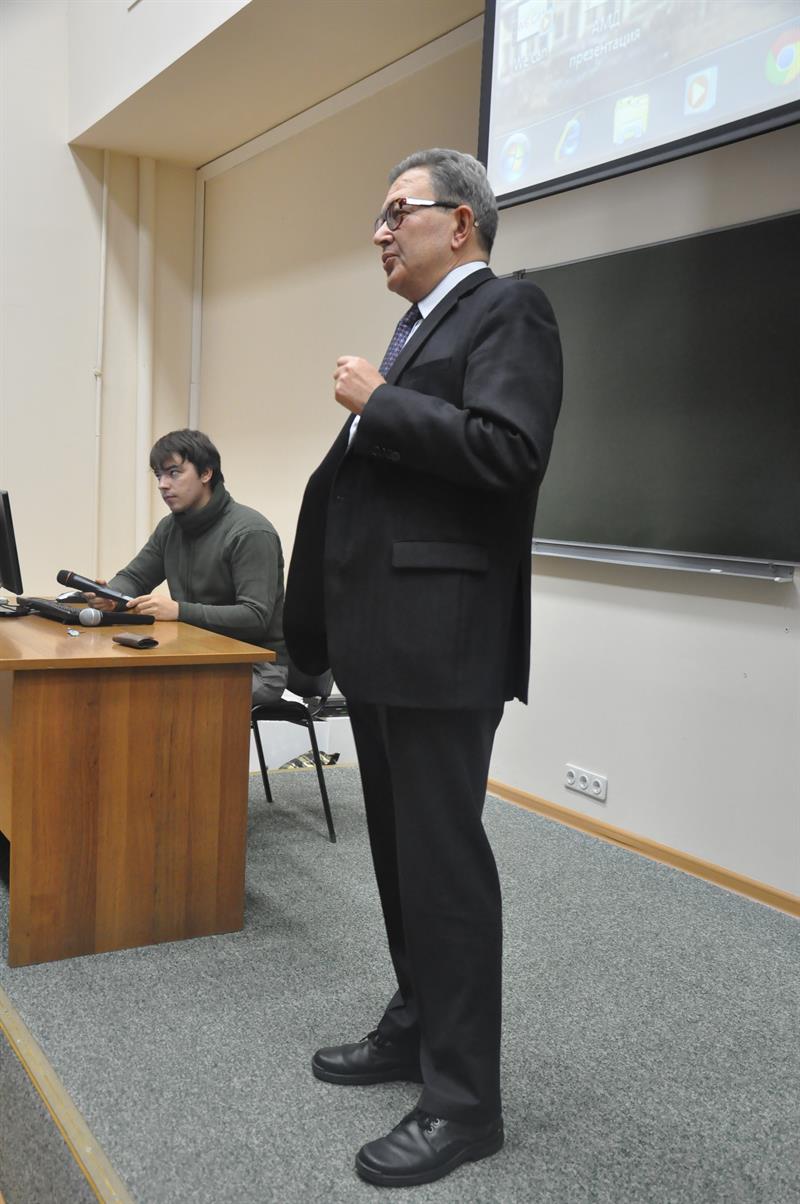 После самобытного выступления студентки КГЭУ, исполнившей русскую народную песню, на сцену поднялся известный российский политолог, доктор политических наук Н.М. Мухарямов, который обратился к гостям на чистом английском языке!