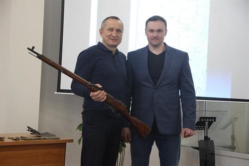 THERE WAS HELD A MEETING OF THE HEAD OF "SHOT" MILITARY-PATRIOTIC ORGANISATION WITH THE KSPEUSTUDENTS. DURING THE MEETING THE RECTOR WAS AWARDEDA RIDGE OF THE LEGENDARY RUSSIAN DESIGNER, SERGEY MOSIN, THE LATTER BEING ASSIGNED FOR THE KSPEU MUSEUM.