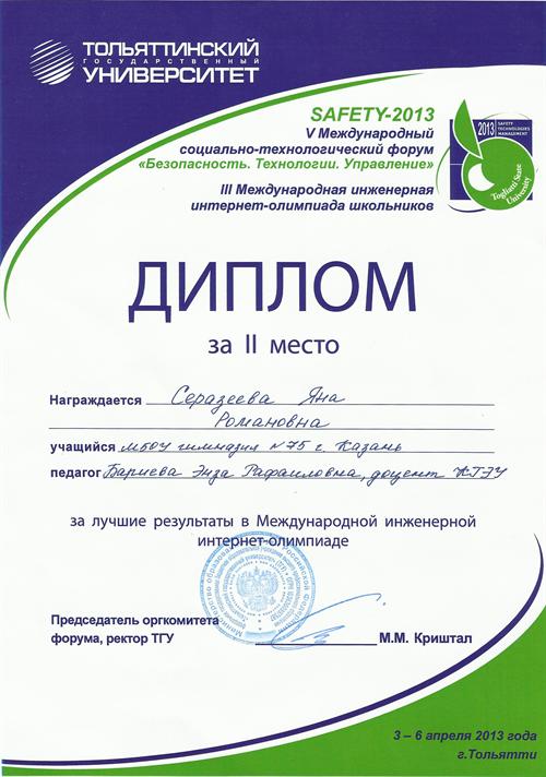 4 апреля 2013 года в Тольяттинском государственном университете в рамках V Международного социально-технологического форума «Безопасность. Технологии. Управление» прошла III Международная инженерная интернет-олимпиада школьников. Под руководством доцента кафедры «Инженерной экологии и рационального природопользования» Бариевой Э.Р. участница школьного кружка «Защитник природы» Серазеева Я.Р. заняла II место и получила диплом за лучшие результаты в Международной инженерной интернет-олимпиаде.