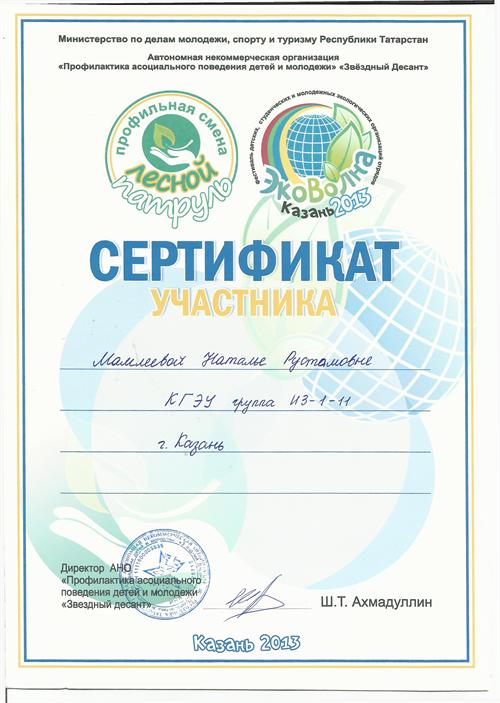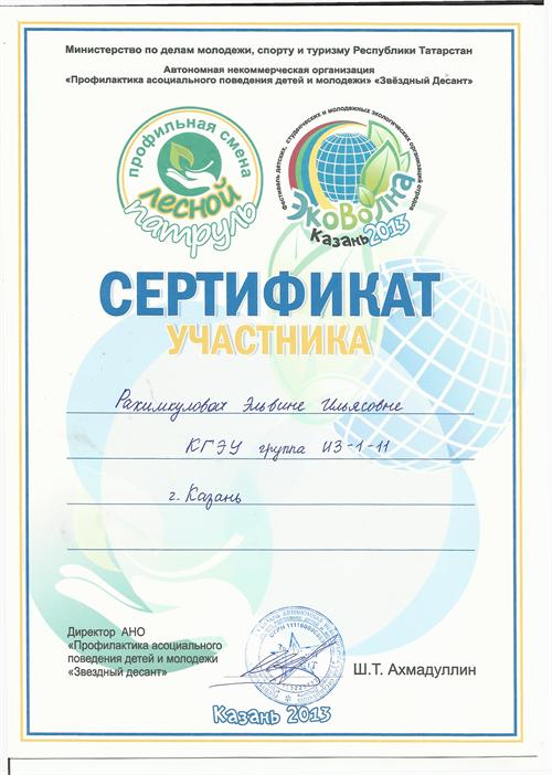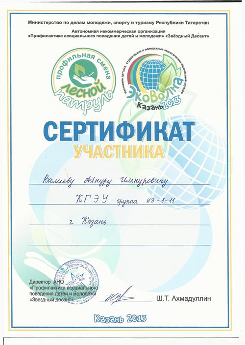 В нем принимала участие команда кафедры ИЭР КГЭУ «GREEN DREAM» («Зеленая мечта») под руководством доц. Бариевой Э.Р., преп. Серазеевой Е.В. В фестивале были предусмотрены различные тренинги по мотивациям, ораторскому искусству и технологии проектного менеджмента. Во время фестиваля команда «GREEN DREAM» защитила проект на тему «Чистый пляж». Участникам программы фестиваля «Эковолна» были вручены сертификаты.