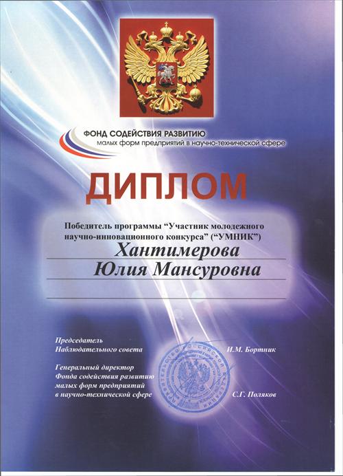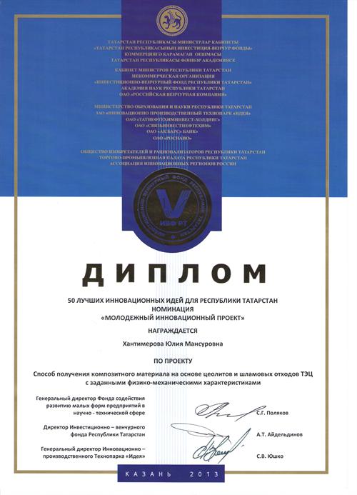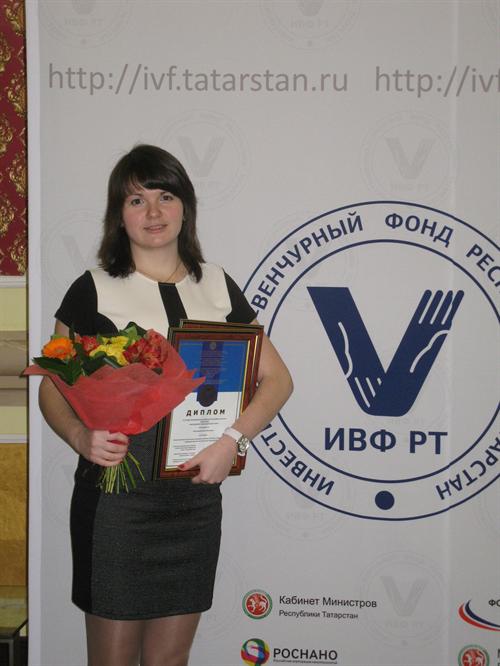 Хантимерова Ю.М. студентка группы ИЗм-1-13, научный руководитель доцент Бариева Э.Р. стала победителем в номинации «МОЛОДЕЖНЫЙ ИННОВАЦИОННЫЙ ПРОЕКТ» в конкурсе грантов: «50 лучших инновационных идей для республики Татарстан», а также в программе грантов «Участник молодежного научно-инновационного конкурса» («УМНИК»).