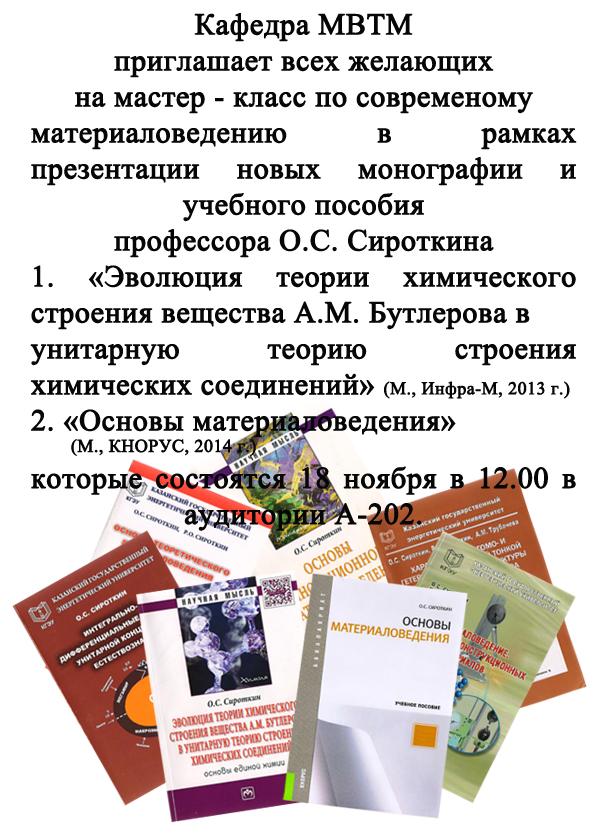 Кафедра МВТМ приглашает всех желающих на мастер-класс по современному материаловедению в рамках презентации новых монографий и учебного пособия профессора О.С. Сироткина
